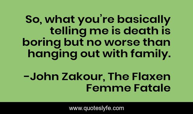 This page presents the quote "So, what you’re basically telling me is death is boring but no worse than hanging out with family.". Author of this quote is John Zakour, The Flaxen Femme Fatale. This quote is about fantasy, comedy, humor, sci-fi,.