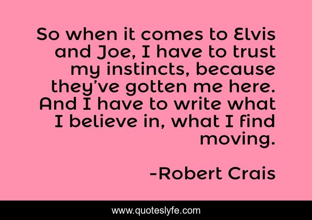 This page presents the quote "So when it comes to Elvis and Joe, I have to trust my instincts, because they’ve gotten me here. And I have to write what I believe in, what I find moving.". Author of this quote is Robert Crais. This quote is about believe-in-yourself, self-confidence, writing,.