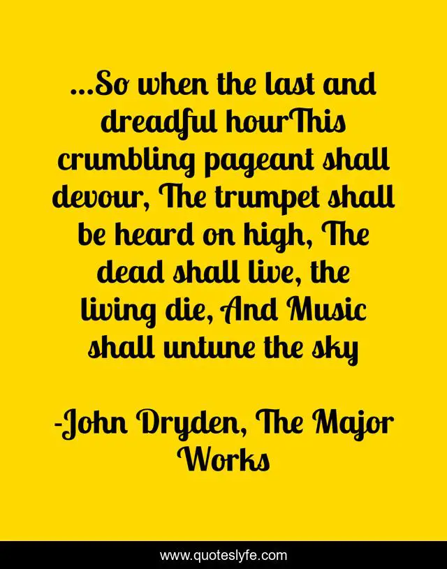 This page presents the quote "…So when the last and dreadful hourThis crumbling pageant shall devour, The trumpet shall be heard on high, The dead shall live, the living die, And Music shall untune the sky". Author of this quote is John Dryden, The Major Works. .