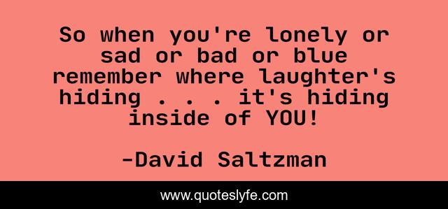 This page presents the quote "So when you're lonely or sad or bad or blue remember where laughter's hiding . . . it's hiding inside of YOU!". Author of this quote is David Saltzman. .