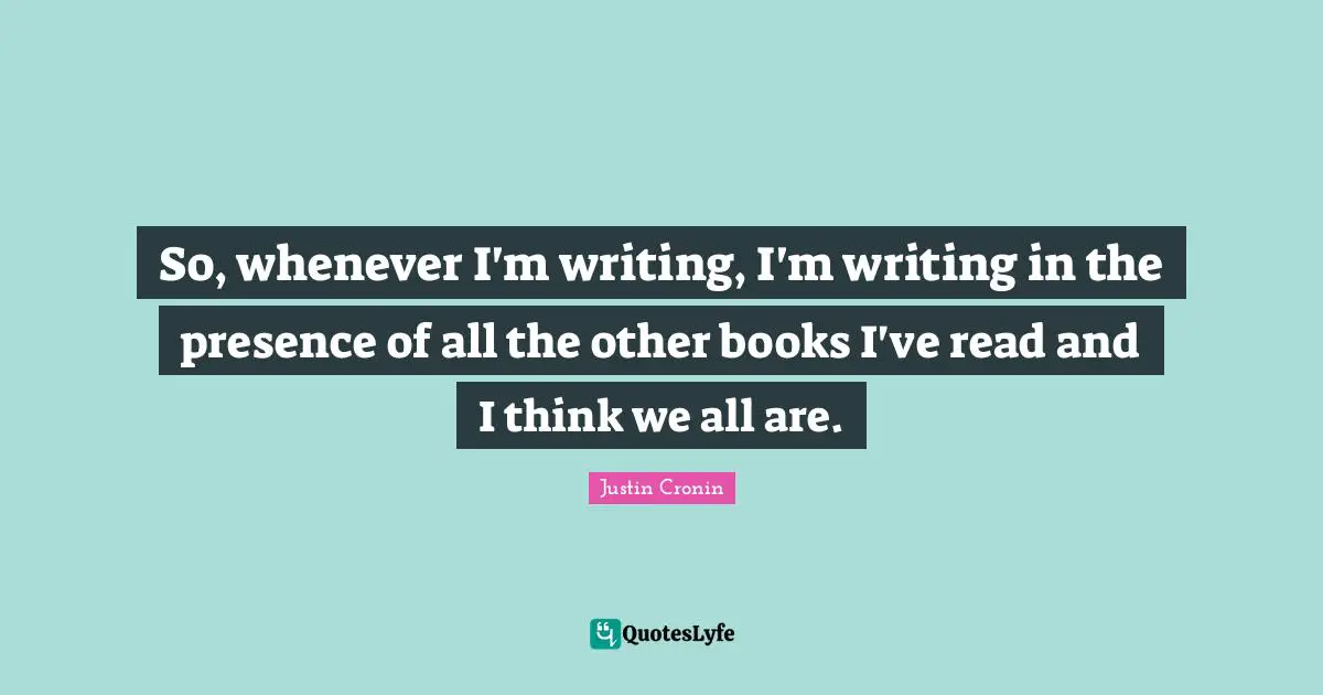This page presents the quote "So, whenever I'm writing, I'm writing in the presence of all the other books I've read and I think we all are.". Author of this quote is Justin Cronin. This quote is about writing, book, thinking,.