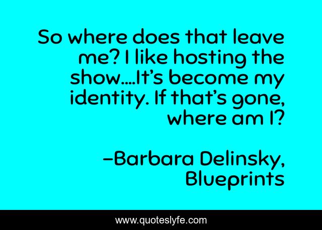 This page presents the quote "So where does that leave me? I like hosting the show....It’s become my identity. If that’s gone, where am I?". Author of this quote is Barbara Delinsky, Blueprints. This quote is about aging, ageism, discrimination, job, workplace, women,.