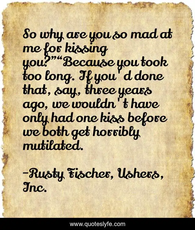 This page presents the quote "So why are you so mad at me for kissing you?”“Because you took too long. If you'd done that, say, three years ago, we wouldn't have only had one kiss before we both get horribly mutilated.". Author of this quote is Rusty Fischer, Ushers, Inc.. This quote is about romance-funny, vampires, ushers, paranormal, werewolves, zombies, young-adult, romantic,.