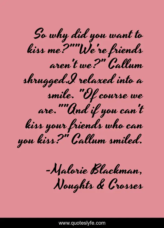 This page presents the quote "So why did you want to kiss me?""We're friends aren't we?" Callum shrugged.I relaxed into a smile. "Of course we are.""And if you can't kiss your friends who can you kiss?" Callum smiled.". Author of this quote is Malorie Blackman, Noughts & Crosses. This quote is about callum, sweet, malorie-blackman, sephy, innocent, humor, noughts-and-crosses,.