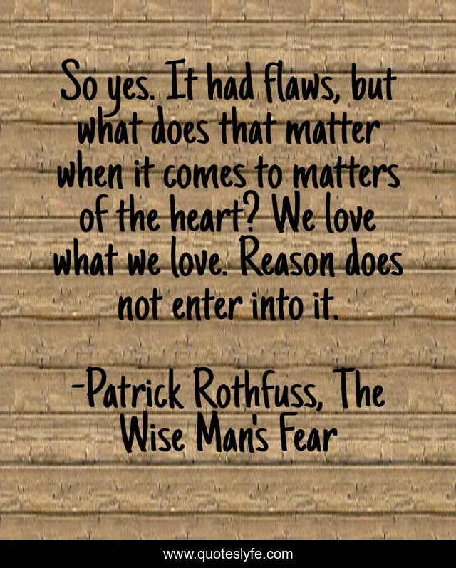 This page presents the quote "So yes. It had flaws, but what does that matter when it comes to matters of the heart? We love what we love. Reason does not enter into it.". Author of this quote is Patrick Rothfuss, The Wise Man's Fear. This quote is about book, love, affection,.