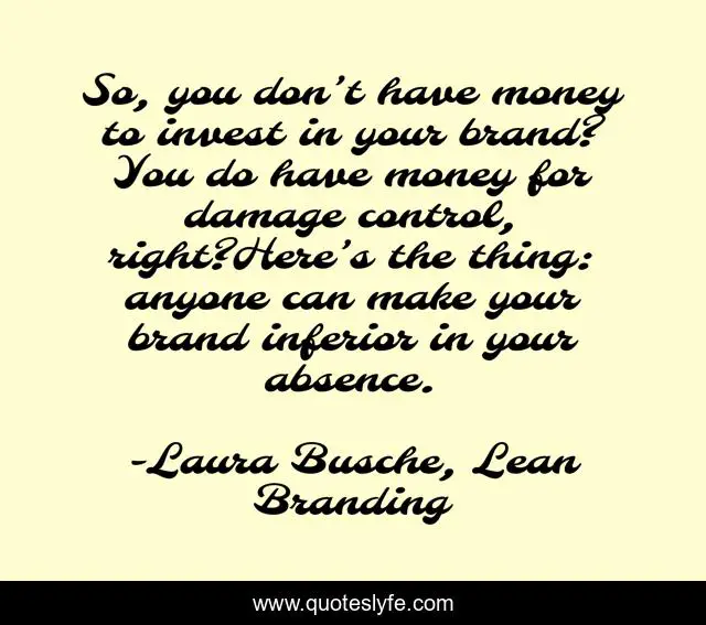 This page presents the quote "So, you don’t have money to invest in your brand? You do have money for damage control, right?Here’s the thing: anyone can make your brand inferior in your absence.". Author of this quote is Laura Busche, Lean Branding. This quote is about business, personal-branding, brand, innovation, entrepreneurship, design, inspirational, branding, enthusiasm,.