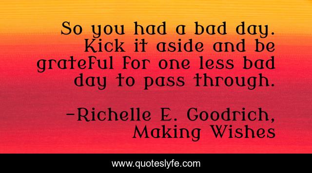 This page presents the quote "So you had a bad day. Kick it aside and be grateful for one less bad day to pass through.". Author of this quote is Richelle E. Goodrich, Making Wishes. This quote is about richelle-e-goodrich, count-your-blessings, bad-day, bright-side, richelle, richelle-goodrich,.