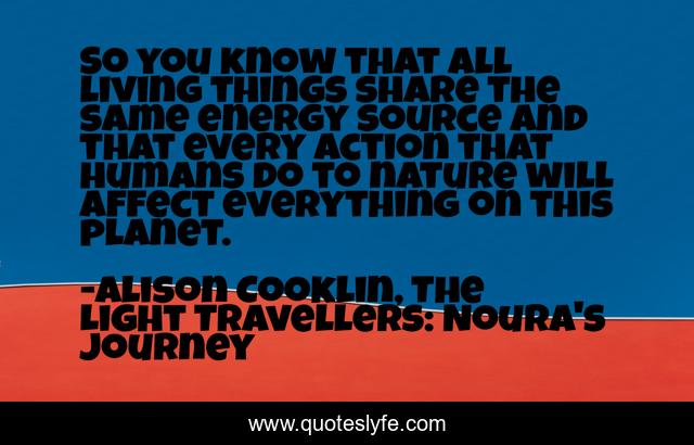 This page presents the quote "So you know that all living things share the same energy source and that every action that humans do to nature will affect everything on this planet.". Author of this quote is Alison Cooklin, The Light Travellers: Noura's Journey. This quote is about environment, ecology, fantasy, children-s-books, environmental-conservation, spirituality, children,.