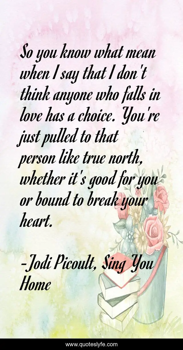 This page presents the quote "So you know what mean when I say that I don't think anyone who falls in love has a choice. You're just pulled to that person like true north, whether it's good for you or bound to break your heart.". Author of this quote is Jodi Picoult, Sing You Home. This quote is about fallinginlove, choice, love, affection, breakups,.