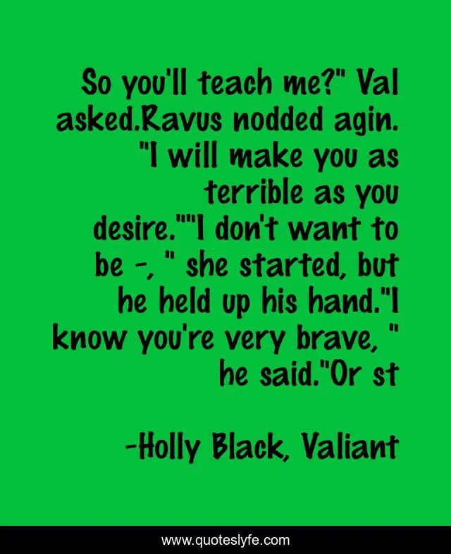 This page presents the quote "So you'll teach me?" Val asked.Ravus nodded agin. "I will make you as terrible as you desire.""I don't want to be -, " she started, but he held up his hand."I know you're very brave, " he said."Or st". Author of this quote is Holly Black, Valiant. This quote is about teaching, learned, brave, stupid, terrible,.