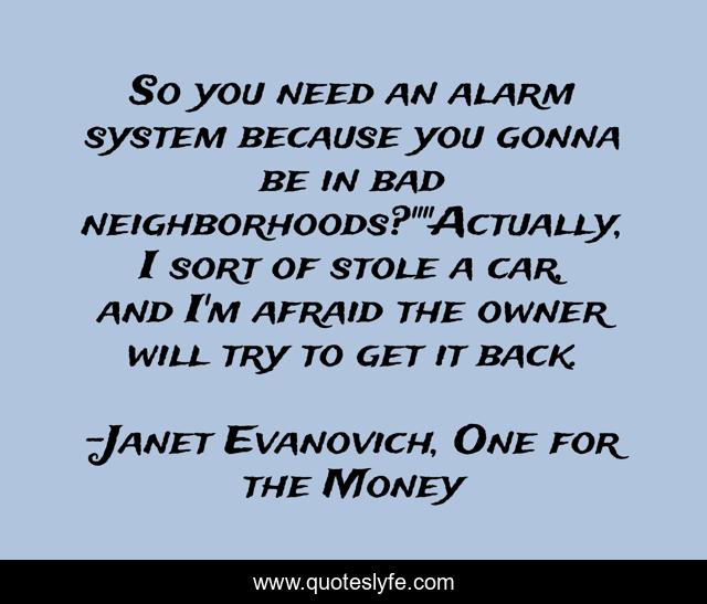 This page presents the quote "So you need an alarm system because you gonna be in bad neighborhoods?""Actually, I sort of stole a car, and I'm afraid the owner will try to get it back.". Author of this quote is Janet Evanovich, One for the Money. .