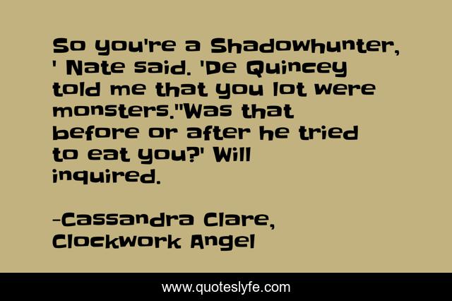 So you're a Shadowhunter, ' Nate said. 'De Quincey told me that you lot were monsters.''Was that before or after he tried to eat you?' Will inquired.