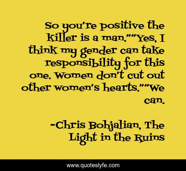 This page presents the quote "So you’re positive the killer is a man.”“Yes, I think my gender can take responsibility for this one. Women don’t cut out other women’s hearts.”“We can.". Author of this quote is Chris Bohjalian, The Light in the Ruins. This quote is about gender, hearts, women,.