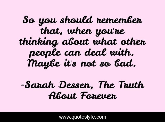 This page presents the quote "So you should remember that, when you're thinking about what other people can deal with. Maybe it's not so bad.". Author of this quote is Sarah Dessen, The Truth About Forever. This quote is about life, experiences, people,.