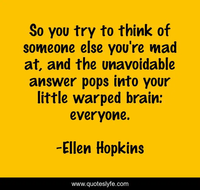 This page presents the quote "So you try to think of someone else you're mad at, and the unavoidable answer pops into your little warped brain: everyone.". Author of this quote is Ellen Hopkins. This quote is about anger, depression, adolescence,.