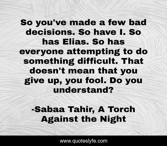 This page presents the quote "So you've made a few bad decisions. So have I. So has Elias. So has everyone attempting to do something difficult. That doesn't mean that you give up, you fool. Do you understand?". Author of this quote is Sabaa Tahir, A Torch Against the Night. This quote is about attempt, decision, bad-decision, don-t-give-up, difficult,.