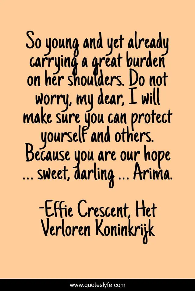 This page presents the quote "So young and yet already carrying a great burden on her shoulders. Do not worry, my dear, I will make sure you can protect yourself and others. Because you are our hope … sweet, darling … Arima.". Author of this quote is Effie Crescent, Het Verloren Koninkrijk. This quote is about book, young-adult, elements,.