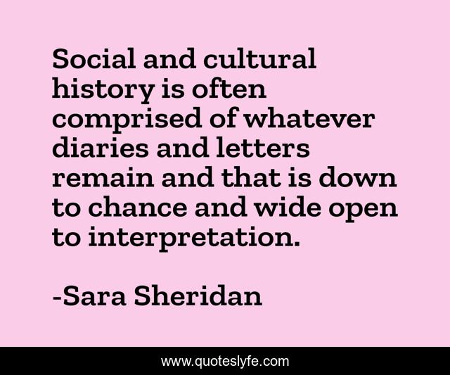 This page presents the quote "Social and cultural history is often comprised of whatever diaries and letters remain and that is down to chance and wide open to interpretation.". Author of this quote is Sara Sheridan. This quote is about interpretation, diaries, cultural, archives, social, letters, history,.