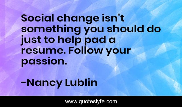 This page presents the quote "Social change isn't something you should do just to help pad a resume. Follow your passion.". Author of this quote is Nancy Lublin. This quote is about passion, help, resume,.