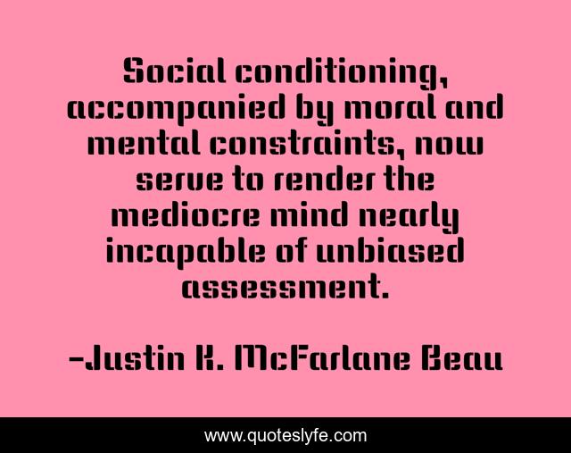 This page presents the quote "Social conditioning, accompanied by moral and mental constraints, now serve to render the mediocre mind nearly incapable of unbiased assessment.". Author of this quote is Justin K. McFarlane Beau. This quote is about close-minded, small-minded, curiosity, culture, inbreeding, average, ignorance, presupposition, sophistication,.