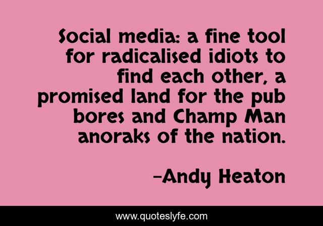 This page presents the quote "Social media: a fine tool for radicalised idiots to find each other, a promised land for the pub bores and Champ Man anoraks of the nation.". Author of this quote is Andy Heaton. This quote is about idiots, radicalisation, bores, social-media, twitter,.