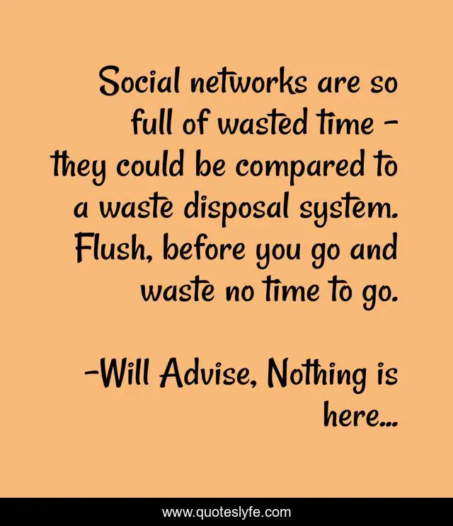 This page presents the quote "Social networks are so full of wasted time - they could be compared to a waste disposal system. Flush, before you go and waste no time to go.". Author of this quote is Will Advise, Nothing is here.... This quote is about comparison, social-media, compared, toilet, wasting, disposal, social, socially-acceptable, system,.