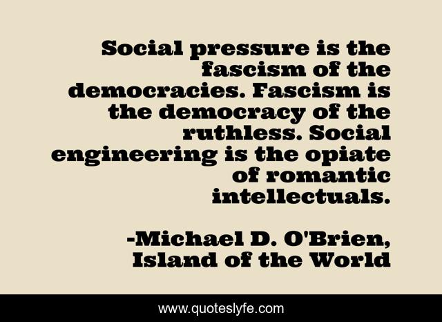 This page presents the quote "Social pressure is the fascism of the democracies. Fascism is the democracy of the ruthless. Social engineering is the opiate of romantic intellectuals.". Author of this quote is Michael D. O'Brien, Island of the World. This quote is about fascism, freedom-of-speech, freedom-of-thought, democracy, freedom,.