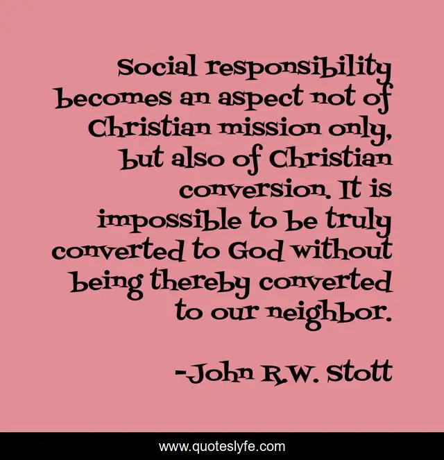 This page presents the quote "Social responsibility becomes an aspect not of Christian mission only, but also of Christian conversion. It is impossible to be truly converted to God without being thereby converted to our neighbor.". Author of this quote is John R.W. Stott. This quote is about conversion, missions, christianity,.