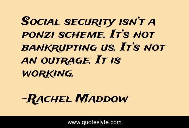 This page presents the quote "Social security isn’t a ponzi scheme. It’s not bankrupting us. It’s not an outrage. It is working.". Author of this quote is Rachel Maddow. This quote is about politics, ponzi-schemes, economics, social-security, united-states,.