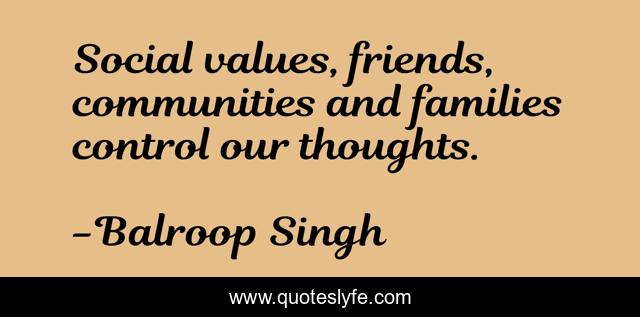 This page presents the quote "Social values, friends, communities and families control our thoughts.". Author of this quote is Balroop Singh. This quote is about society, friends, family, thoughts,.