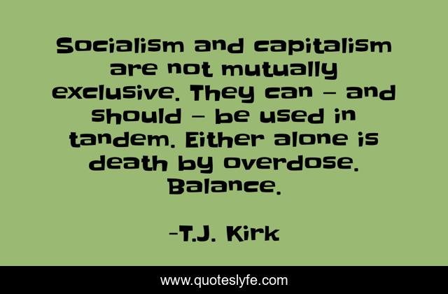 This page presents the quote "Socialism and capitalism are not mutually exclusive. They can — and should — be used in tandem. Either alone is death by overdose. Balance.". Author of this quote is T.J. Kirk. This quote is about balance, socialism, capitalism,.