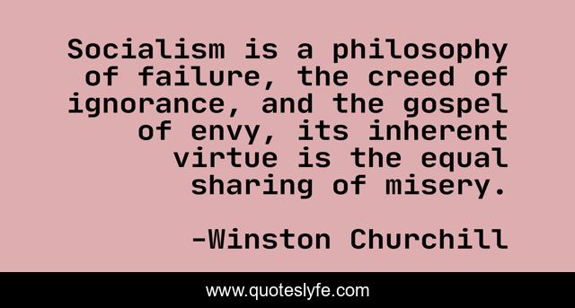 This page presents the quote "Socialism is a philosophy of failure, the creed of ignorance, and the gospel of envy, its inherent virtue is the equal sharing of misery.". Author of this quote is Winston Churchill. This quote is about philosophy, ignorance,.