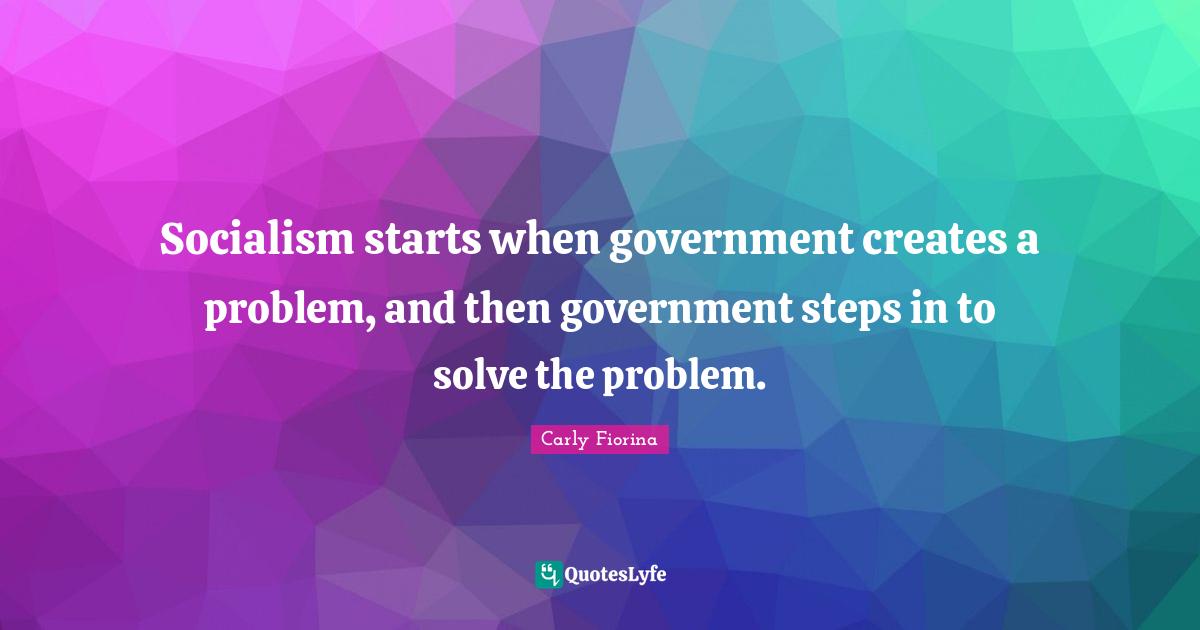 This page presents the quote "Socialism starts when government creates a problem, and then government steps in to solve the problem.". Author of this quote is Carly Fiorina. This quote is about steps, socialism, government, problem, solve,.