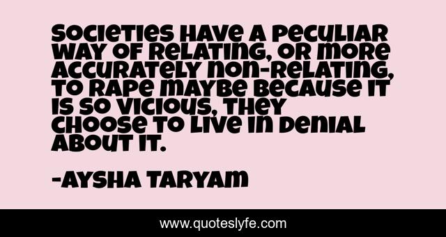 This page presents the quote "Societies have a peculiar way of relating, or more accurately non-relating, to rape maybe because it is so vicious, they choose to live in denial about it.". Author of this quote is Aysha Taryam. This quote is about denial, culture, rape-culture, society, denial-of-abuse, rape,.