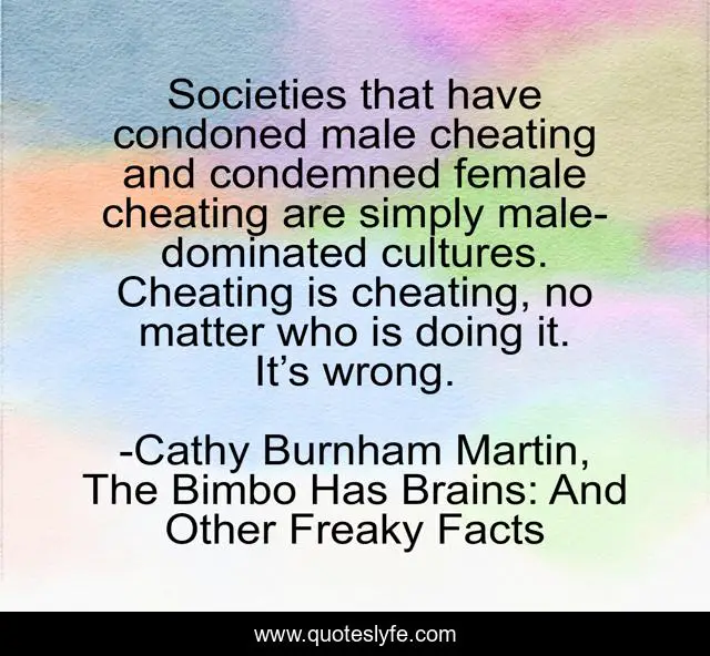 This page presents the quote "Societies that have condoned male cheating and condemned female cheating are simply male-dominated cultures. Cheating is cheating, no matter who is doing it. It’s wrong.". Author of this quote is Cathy Burnham Martin, The Bimbo Has Brains: And Other Freaky Facts. This quote is about cheating, male-domination, men, society, double-standards, right-and-wrong, women,.