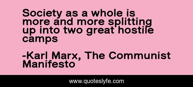 This page presents the quote "Society as a whole is more and more splitting up into two great hostile camps". Author of this quote is Karl Marx, The Communist Manifesto. This quote is about relationships, division, communism, people, aggressive-behavior, hostility, inferiority, community, hierarchy,.