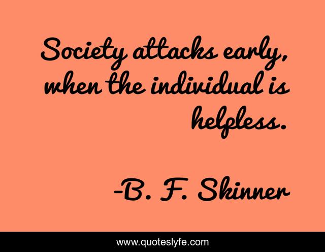 This page presents the quote "Society attacks early, when the individual is helpless.". Author of this quote is B. F. Skinner. This quote is about early, attacks, individual,.