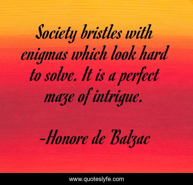 This page presents the quote "Society bristles with enigmas which look hard to solve. It is a perfect maze of intrigue.". Author of this quote is Honore de Balzac. This quote is about perfect, hard, look,.