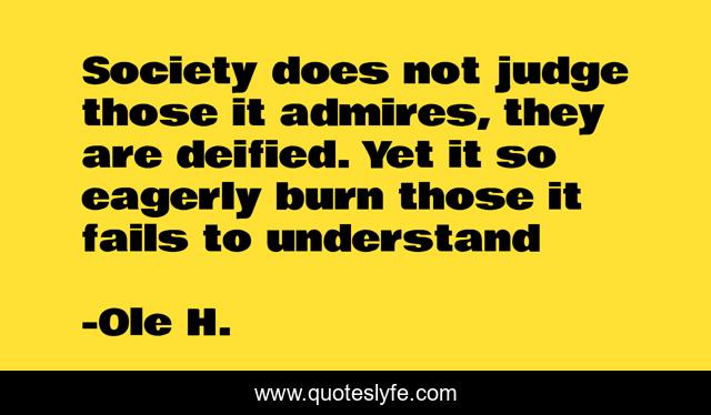 This page presents the quote "Society does not judge those it admires, they are deified. Yet it so eagerly burn those it fails to understand". Author of this quote is Ole H.. This quote is about society, admiration,.