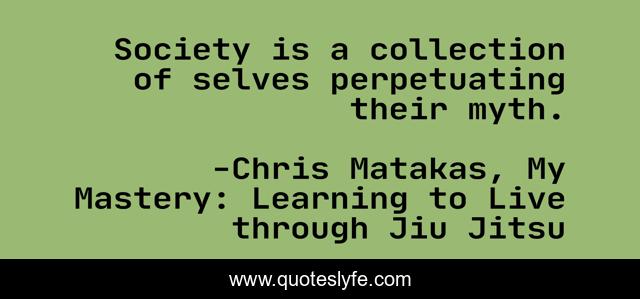 This page presents the quote "Society is a collection of selves perpetuating their myth.". Author of this quote is Chris Matakas, My Mastery: Learning to Live through Jiu Jitsu. This quote is about society, buddhism, the-self, identity, spirituality,.