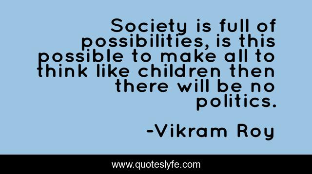 This page presents the quote "Society is full of possibilities, is this possible to make all to think like children then there will be no politics.". Author of this quote is Vikram Roy. This quote is about politics-observation, society, society-thinking,.