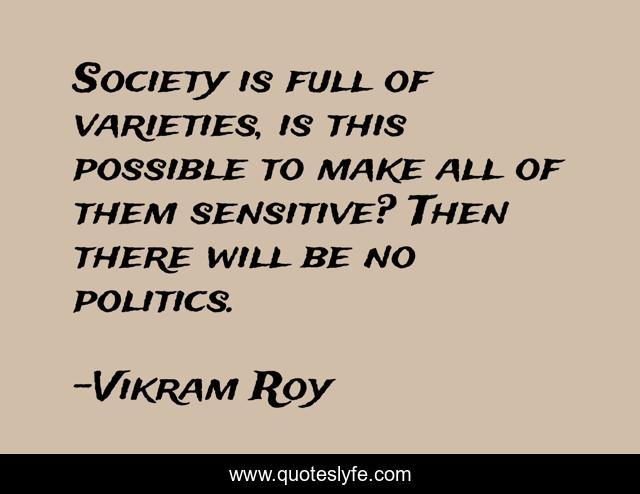 This page presents the quote "Society is full of varieties, is this possible to make all of them sensitive? Then there will be no politics.". Author of this quote is Vikram Roy. This quote is about enthusiasm, philosophy, political, inspirational, social,.
