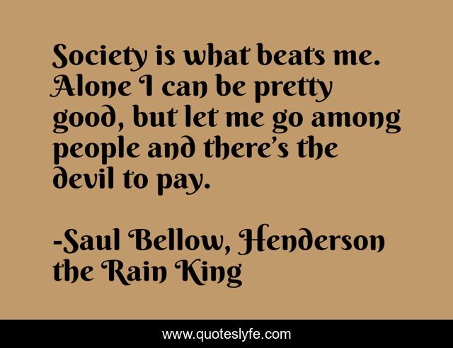 This page presents the quote "Society is what beats me. Alone I can be pretty good, but let me go among people and there’s the devil to pay.". Author of this quote is Saul Bellow, Henderson the Rain King. .