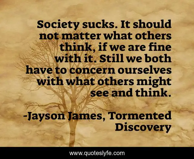 This page presents the quote "Society sucks. It should not matter what others think, if we are fine with it. Still we both have to concern ourselves with what others might see and think.". Author of this quote is Jayson James, Tormented Discovery. This quote is about society, being-yourself,.
