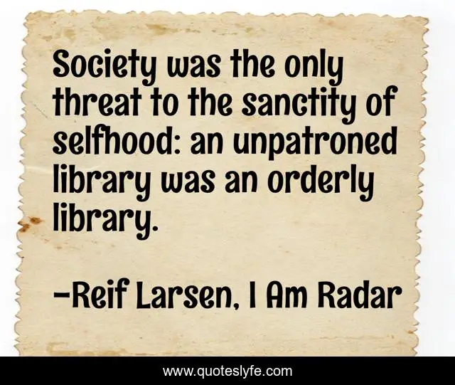 This page presents the quote "Society was the only threat to the sanctity of selfhood: an unpatroned library was an orderly library.". Author of this quote is Reif Larsen, I Am Radar. This quote is about libraries, society, self,.