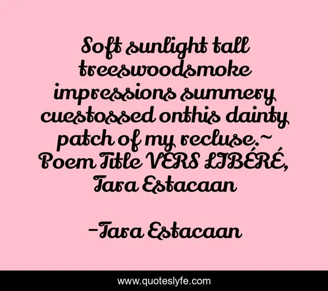 This page presents the quote "Soft sunlight tall treeswoodsmoke impressions summery cuestossed onthis dainty patch of my recluse.~ Poem Title VERS LIBÉRÉ, Tara Estacaan". Author of this quote is Tara Estacaan. This quote is about life, peace, poetry, sunlight, woods, trees, freeverse,.