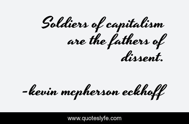 This page presents the quote "Soldiers of capitalism are the fathers of dissent.". Author of this quote is kevin mcpherson eckhoff. This quote is about fatherhood, descent, capitalism, insemination, soldiers, war,.