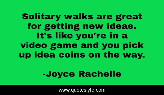 This page presents the quote "Solitary walks are great for getting new ideas. It's like you're in a video game and you pick up idea coins on the way.". Author of this quote is Joyce Rachelle. This quote is about video-games, walking, computer-games, art, psychology, inspiration-for-writing, thinking, solitude, writing-inspiration,.