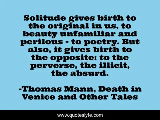This page presents the quote "Solitude gives birth to the original in us, to beauty unfamiliar and perilous - to poetry. But also, it gives birth to the opposite: to the perverse, the illicit, the absurd.". Author of this quote is Thomas Mann, Death in Venice and Other Tales. This quote is about solitude, perverse, absurd, beauty,.