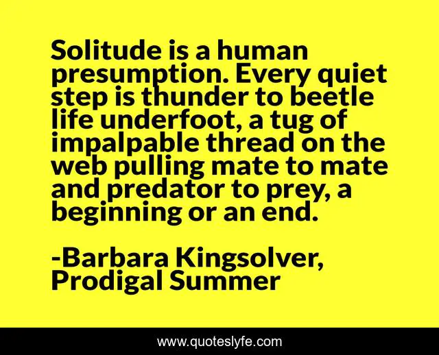 This page presents the quote "Solitude is a human presumption. Every quiet step is thunder to beetle life underfoot, a tug of impalpable thread on the web pulling mate to mate and predator to prey, a beginning or an end.". Author of this quote is Barbara Kingsolver, Prodigal Summer. .